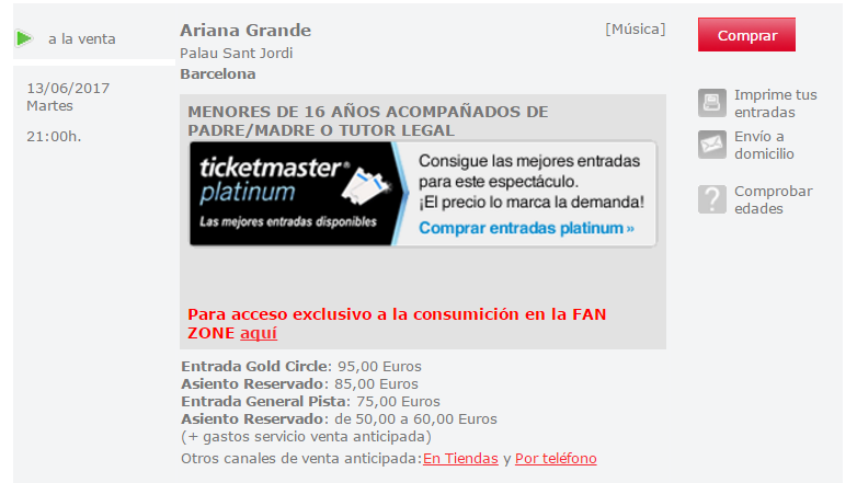 Hemos dejado esta captura del concierto de Ariana Grande porque las de Lady Gaga están agotadas (las del día 22) y no aparece el botón de Comprar.