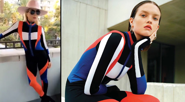 Gaga no lo puso difícil esta vez. Tal y como ella misma puso, es una única pieza entera de la colección 'Otoño / Invierno 2016' de Emilio Pucci, el Look 7 exactamente (puedes ver la colección aquí). Es un mono que combina los colores negro, azul, naranja y blanco, dándole un aspecto deportivo con una cremallera delantera.