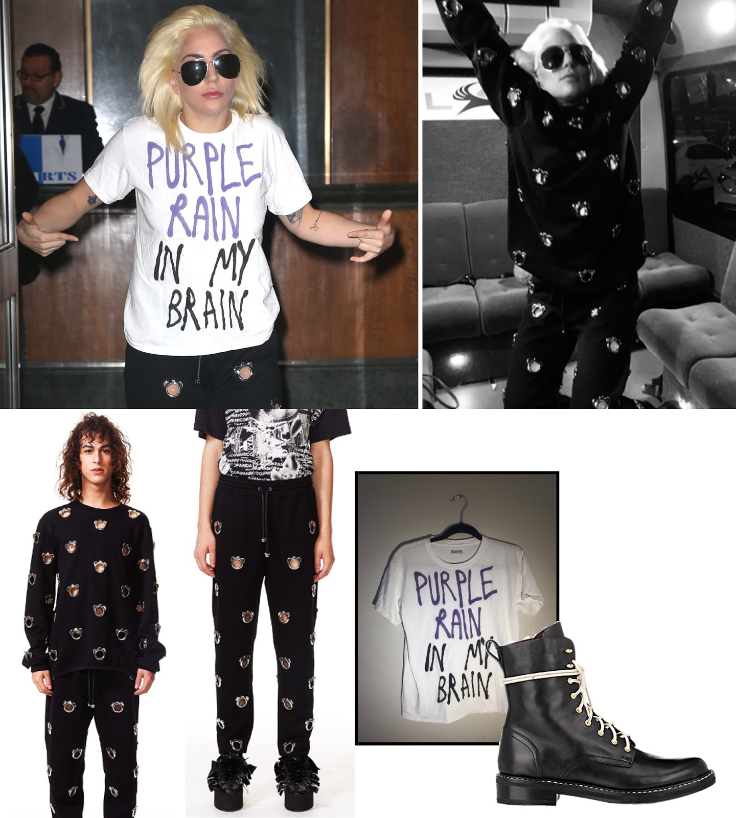 En esta ocasión, la cantante opta por una camiseta quasi-customizada por James Concannon en la que se puede leer "PURPLE RAIN IN MY BRAIN" en violeta y negro sobre blanco, y un total look de la última colección (Resort 2017) de Nicopanda, como pudimos ver en su cuenta de Instagram. Se trata de una combinación de sudadera y pantalones negros con agujeros en forma de panda (el diseñador es un fanático de estos animales) y las botas 'Emil' de Rag & Bone, en color negro con cordones blancos, que también aparecieron en el videoclip de 'Perfect Illusion.'