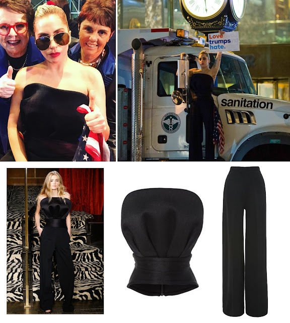 De aquí, pasamos a la noche electoral. Mientras se recontaban los votos, pudimos ver a Gaga junto a otras celebrities -como Katy Perry- junto a Hillary Clinton. En esta ocasión, optó por un total look de la última colección de su amigo y diseñador Brandon Maxwell (el look 20). Se trata de un traje en dos piezas (top y pantalones) que dan la impresión de ser una pieza única en forma de mono, monócroma en negro con perneras anchas y pliegos.