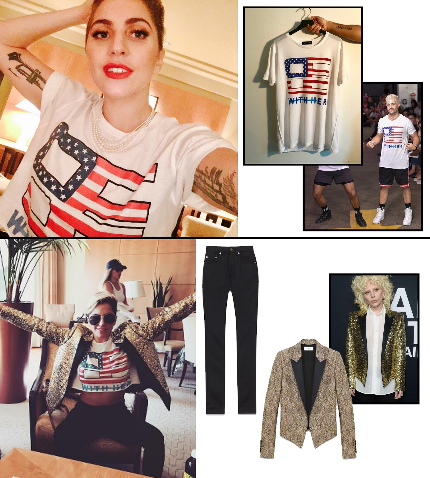 En aquella ocasión, optó por una camiseta básica en color blanco con un estampado de la bandera estadounidense de Baja East. Se trata del 'Be With Her' de su colección creada para la ocasión. Además de una bandera americana para acentuar su patriótico outfit, Mother Monster decidió combinarlo con un blazer que es posible que os suene. Se trata de un customizado del The Spencer Jacket de Yves Saint Laurent, que ya lució en el pasado desfile de la misma marca, en color dorado con solapas en negro.