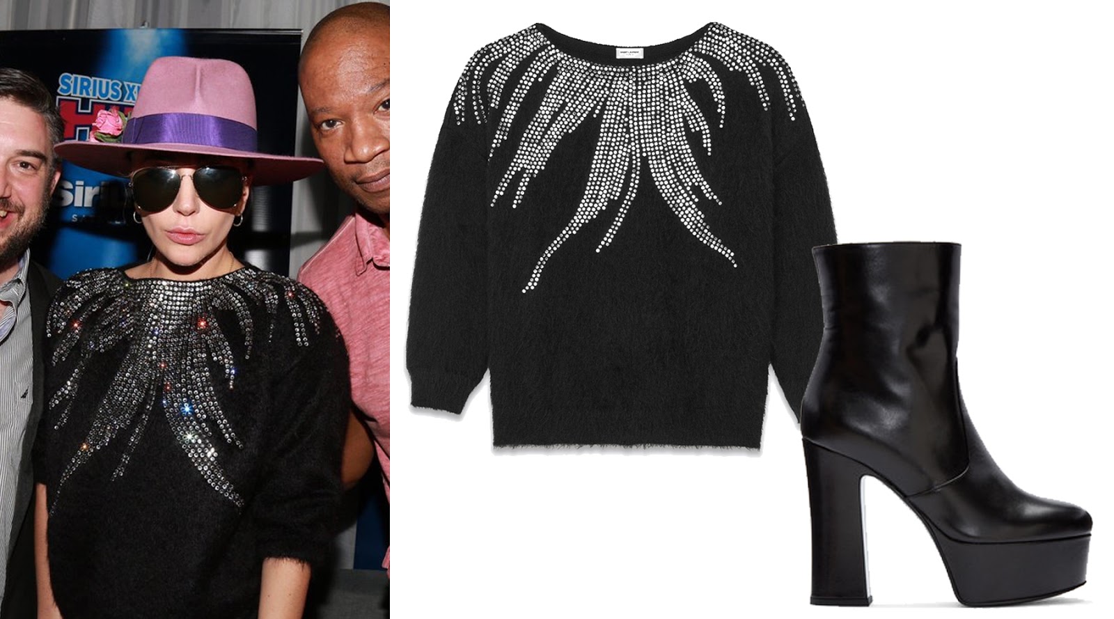 Poco antes de su actuación en los American Music Awards, Lady Gaga hizo una visita sorpresa en la radio 'SiriusXM Hits 1', donde la pudimos ver vistiendo una sudadera en color negro con un diseño de cristales con forma de llama de la colección permanente de Yves Saint Laurent, cuello de barco y mangas largas. Combinó esta sudadera con unos leggings en color negro, y una vez más, las plataformas 'Candy' de Yves Saint Laurent y un sombrero bespoke de Gladys Tamrz.
