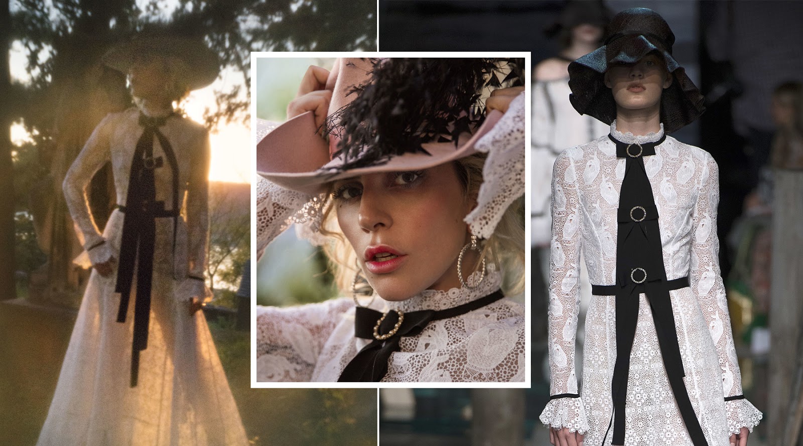 En las siguientes imágenes, podemos ver a Gaga vestida por Erdem. El look 37 de la colección 'Primavera / Verano 2017' del diseñador canadiense es un vestido en color blanco hasta el suelo, mangas larga y cuello alto, que contrasta con la gargantilla en color negro, detallada con perlas y aros metálicos. En cuanto a los complementos, Mother Monster luce joyas de Chopard y Fred Leighton y un el sombrero 'Montana Stardust' en color rosa de Lack of Color.
