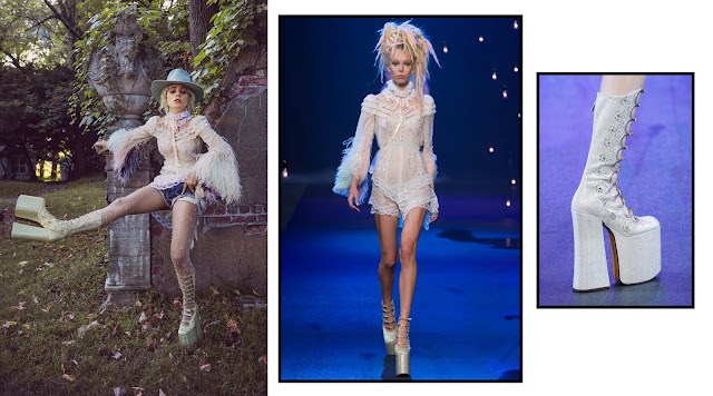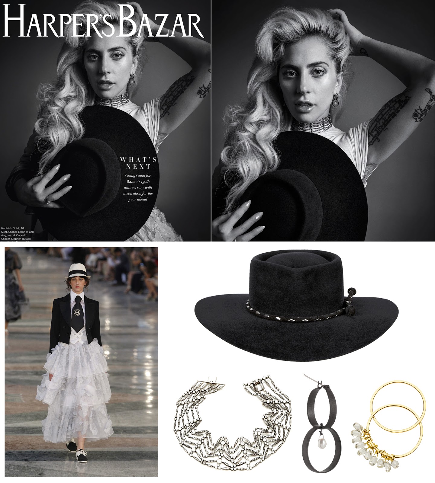 En una entrevista que concedió a la revista (la puedes ver aquí), Gaga lució las míticas BEYOND-1020 de Pleaser Boots y un nuevo sombrero customizado, en color frambuesa, de Gladys Tamez.