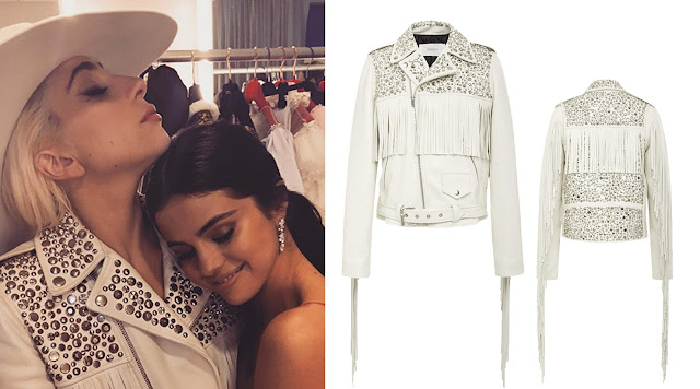 El primer outfit de la noche, es un precioso tuxedo en color blanco, parte de la colección 'Primavera / Verano 2017' de su amigo Brandon Maxwell, parte del look 34 del mismo. Cuenta con un cuello en forma de V, con escote generoso y unos pantalones de crepé también blancos y solapas anchas. Bajo la americana, Gaga luce un mono a juego, que completa en look. En cuanto a los complementos, el sombrero es una nueva pieza customizada de Gladys Tamez. Siguiendo con piezas customizadas, tenemos las botas con plataforma de Pleaser Boots, en piel blanca (que lució en la gala de los Oscars).