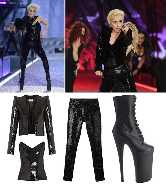 Con el cambio de canción, llegó el cambio de outfit. Esta vez, para la actuación de 'A-YO', Gaga opta por diferentes piezas de la última colección de Hedi Slimane para YSL, como el tuxedo en color negro con lentejuelas del look 38, el top sin mangas en forma de V del look 31 o los leggings del look 20, todo en lentejuelas negras. Como complementos, caben mencionar el cinturón oversized de YSL y las plataformas del 25 centímetros de Pleaser Boots.