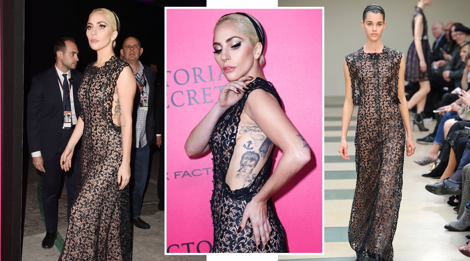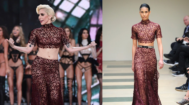 Y después, llegó el desfile. Mientras los ángeles desfilaban, Gaga comenzó a cantar su nuevo single, 'Million Reasons', vistiendo el look 15 de la colección 'Otoño / Invierno 2016' de YolanCris. Este vestido de manga larga y cola de sirena está hecho de encaje negro y cientos detalles florales en color rojo, junto a un cuello alto, una espalda abierta y un chal. Bajo el vestido, podemos ver las clásicas BEYOND-1020 de Pleaser Boots. Y como complemento, un par de pendientes de Cartier.