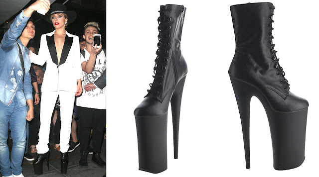 En cuanto al calzado, es sencillo identificar las 'BEYOND-1020' en color negro mate de Pleaser Boots, con 25 centímetros de plataforma y altura hasta el tobillo.
