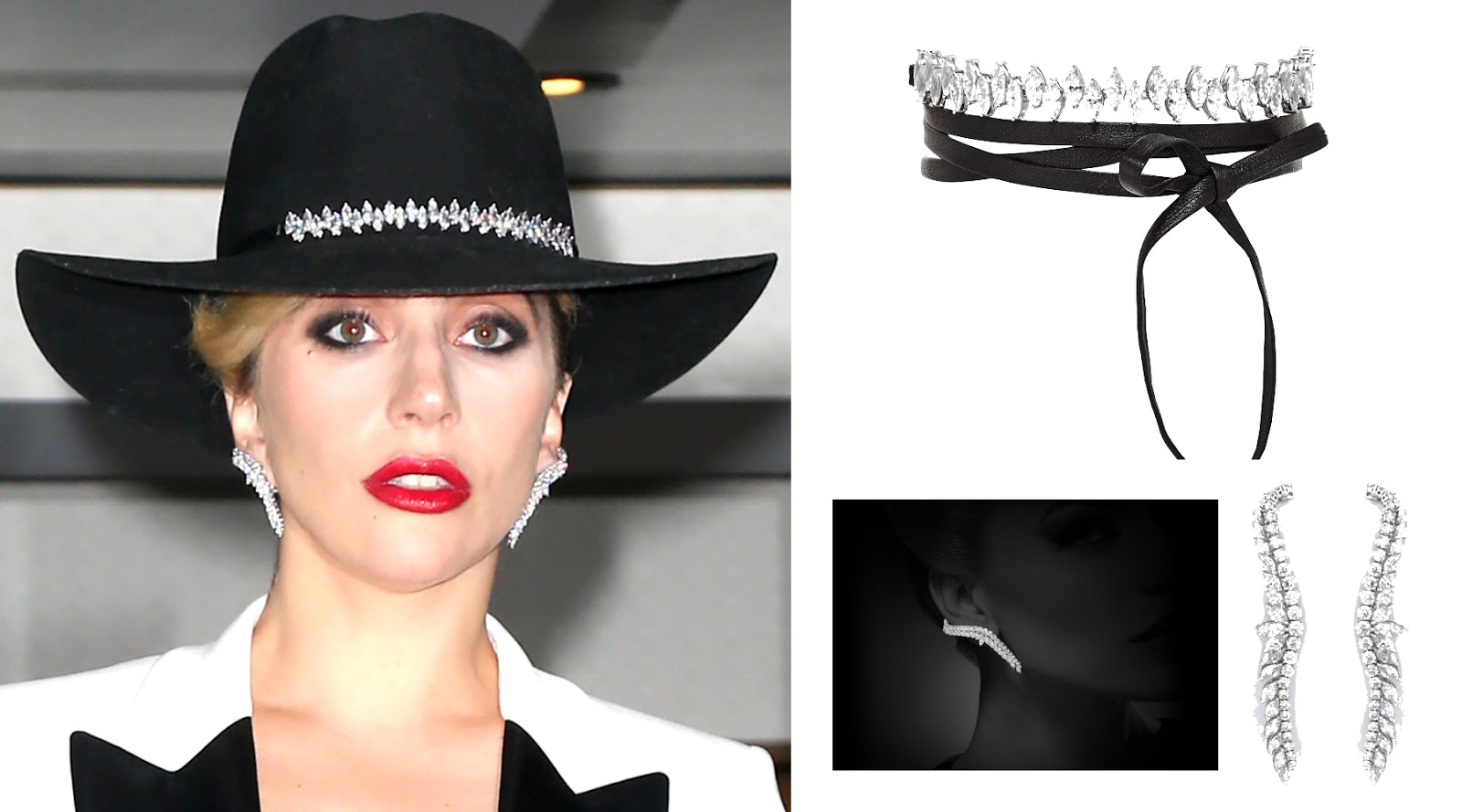 Los complementos, son cosa aparte. En esta ocasión, Gaga decide llevar un sombrero de estilo cow-boy de Yves Saint Laurent que decide hacer suyo añadiéndole un choker de Fallon Jewerly. Este modelo en especial, el 'Jagged Edge Choker' de la colección 'Monarch' está hecho de circonitas cúnibas y una cinta en piel negra. Para terminar, los pendientes son el modelo 'EA1396' de la colección 'Timeless Tiara' de Yeprem,