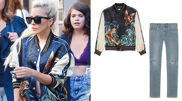 Estando acostumbrados como estamos, ya nos sorprende que haya optado por un look completo de su diseñador favorito, Yves Saint Laurent (la colección 'RTW' de Hedi Slimane). En esta ocasión ha optado por la chaqueta 'TEDDY' en azul marino, con un dibujo de un tigre y un águila marrón dibujado. Una chaqueta, en resumidas cuentas, de estilo béisbol con pipping en la mangas interiores y cuello, mangas y cintura de cordoncillo. En cuanto a los vaqueros con las rodillas rotas, son otro modelo de la misma colección, de talle bajo en color azul vintage.