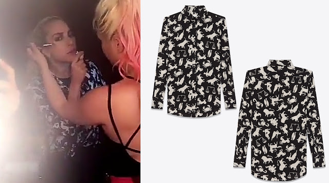 En el primer video, podemos ver como la cantante neyorquina se encuentra en un set de maquillaje, vistiendo una camisa estampada y unos pantalones básicos en color negro. En esta ocasión, una vez más, Mother Monster opta por la colección 'RTW' de Yves Saint Laurent para lucir un total look de la diseñadora Hedi Slimane. El pantalón de tiro alto en color negro se trata muy seguramente del clásico pantalón de la firma francesa con cinco bolsillos. En cuanto a la camisa que lleva, se trata de una camisa en color blanco y negro con un estampado de signos zodiacos, también de la misma marca, con el cuello en estilo París y dobladillo en las mangas, además de cierre delantero con botones.