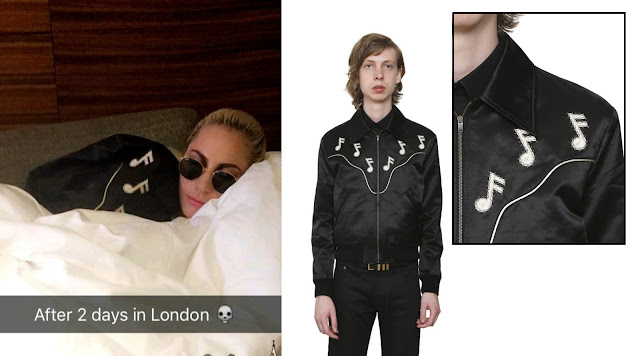 Más tarde, Gaga volvió a actualizar su red social, enseñándonos una foto de ella misma tumbada en en una cama. Y sí, lo habéis adivinado, de nuevo, vestida por YSL. En esta ocasión, se trata del 'Black Music Notes Satin Teddy Jacket' de la colección masculina de la misma. Una chaqueta con cuello estilo camisa, cremallera delantera, dobladillo y puños de canalé o elásticos, dos bolsillos interiores y dos más exteriores, y lo más importante, con bordado musical tanto en la parte delantera como trasera.