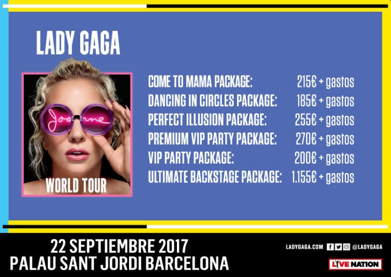 * Los horarios mostrados en el ticket o proceso de compra pueden reflejar la hora de apertura general de puertas o inicio del concierto. El Meet&Greet Package puede comenzar horas antes de la apertura general de puertas. Los horarios detallados serán publicados y se comunicarán vía email a través de VIP NATION unos días antes del concierto. Lady Gaga no aparecerá en el soundcheck.