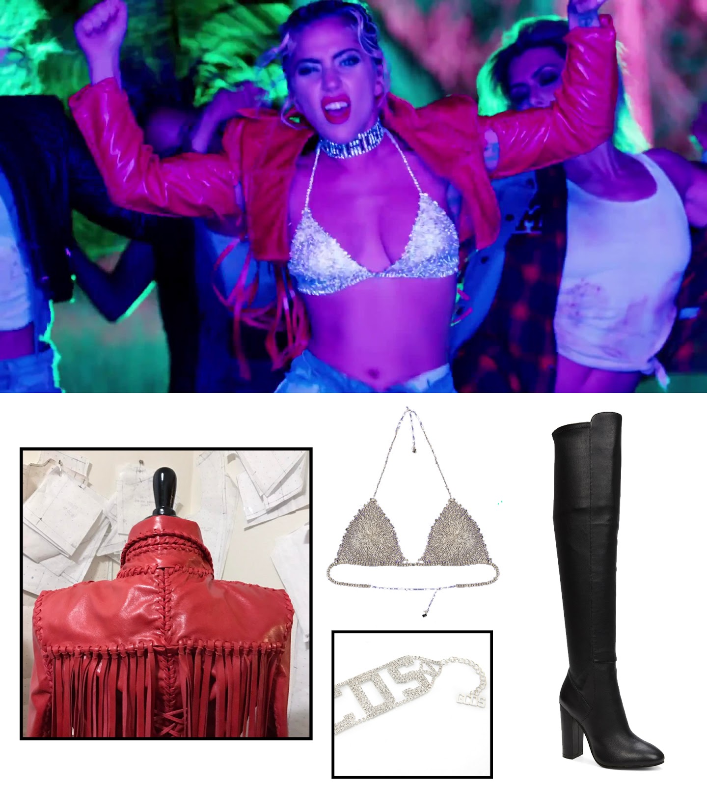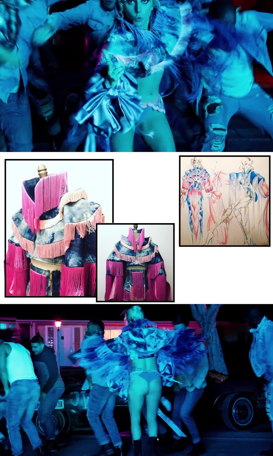 ¡Segunda escena de baile! En esta ocasión, le llega el momento de brillar a uno de los mejores outfits que Mother Monster ha lucido en mucho tiempo. Confeccionado a mano por Alex Noble, conocido por haber diseñado también la chaqueta con flecos azul del videoclip de Judas, esta chaqueta es una genialidad en color vaquero, con infinitas capas de flecos en color azul y rosa, voluminosos satinados en rosa y larga cola en la parte trasera. Para terminar con su look más chocante, Gaga decide llevar las botas con tacón Dianthus de Chloe Gosselin, que se caracterizan por un cierre de cremallera asimétrico.