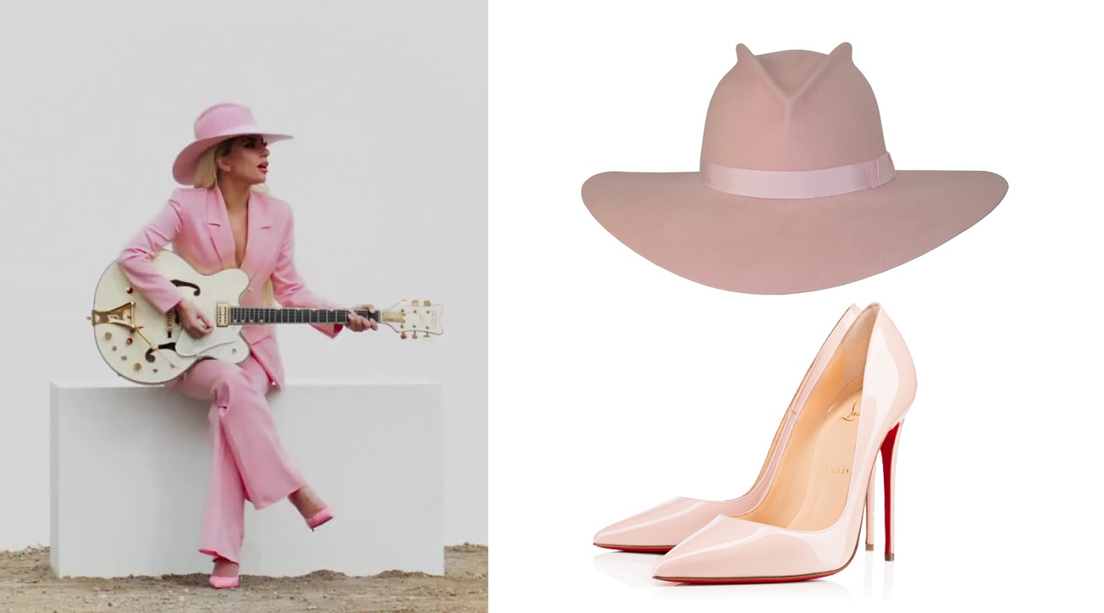 Como ya es costumbre en la era Joanne, el videoclip empieza donde termina Million Reasons. Como ya analizamos en el post sobre los outfits del aquel videoclip, en la primera escena Gaga luce un traje color rosa pálido, diseño customizado por el diseñador británico Alexander Lewis. Pero a diferencia del videoclip anterior, Mother Monster opta por cambiar su sombrero al clásico Lady Bianca de Gladys Tamez en color rosa (el mismo de la carátula de Joanne). Sus tacones son los So Kate de Christian Louboutil en piel rosa.