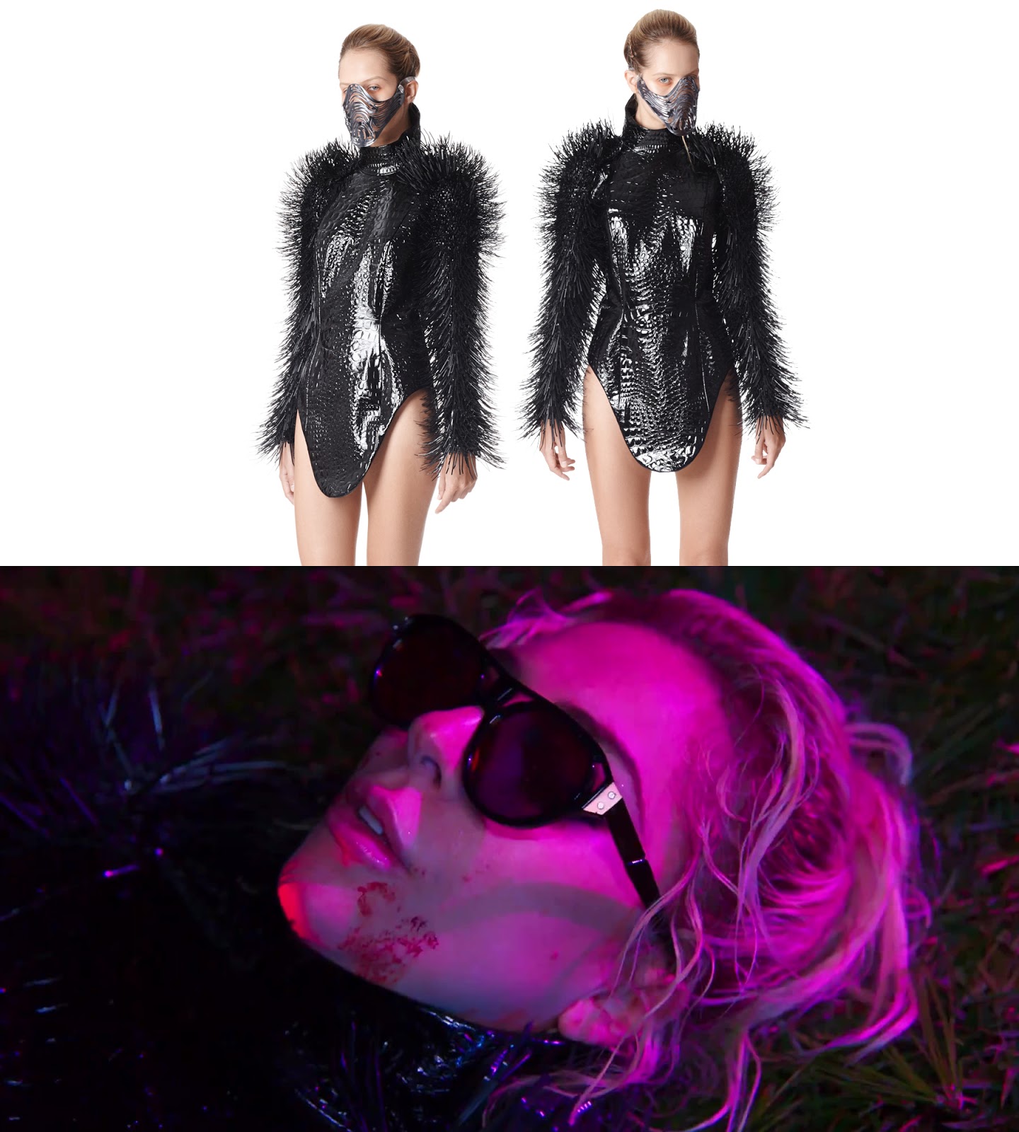 En la escena en la que vemos a la cantante posar en una carretera, sobrevivir a un golpe y montarse en moto, no podría faltar un catsuit customizado en piel negra de Christian Cowan-Sanluis, que ya ha creado diferentes piezas para Gaga. Como se puede ver en la imagen, el customizado es una reedición de uno de los looks de su futura nueva colección. Al body de cuerpo entero, Gaga decide añadirle el mismo modelo de sombrero de Gladys Tamez, en color negro, y las botas Antella de Aldo en piel también negra.